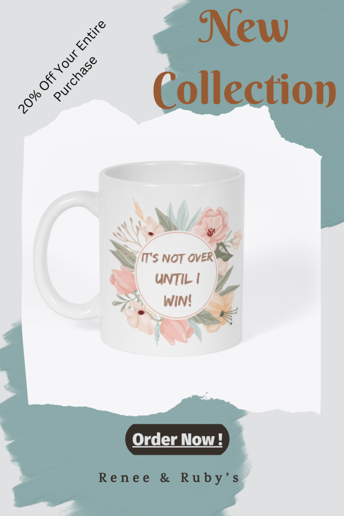 Explore the ‘It’s Not Over Until I Win’ Collection from Renee & Rubys, a bold and beautiful line of journals, mugs, tees, and gifts that remind you (or someone you love) that your story isn’t over – it’s just getting good.  🛍️ Enjoy 20% off your entire order with code ENJOY at checkout!  ✨Click here to shop the collection and spark your daily inspiration
